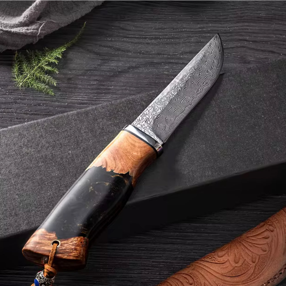 Crafted with precision, this 9-inch handmade knife features a 4.0-inch Japanese VG10 Damascus steel blade known for its razor-sharp edge and unique wave pattern. The ergonomic handle blends stabilized wood and resin for durability and a striking appearance. Includes a hand-tooled leather sheath for secure carry and rustic charm. Ideal for collectors, outdoorsmen, and bushcraft enthusiasts.